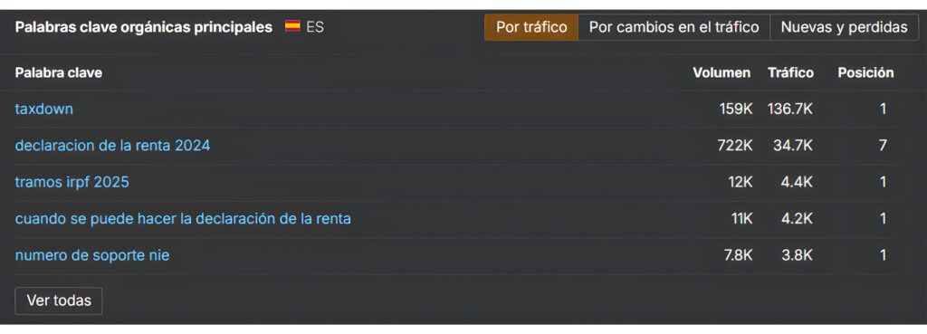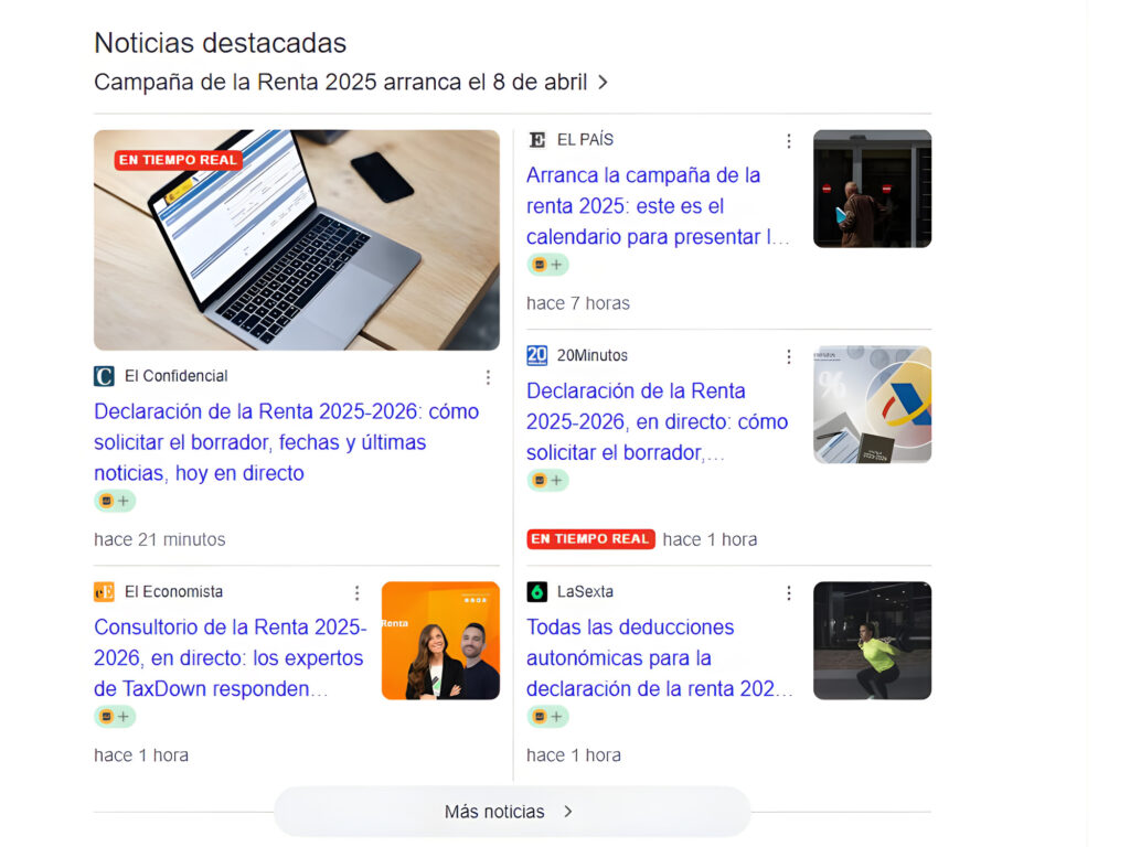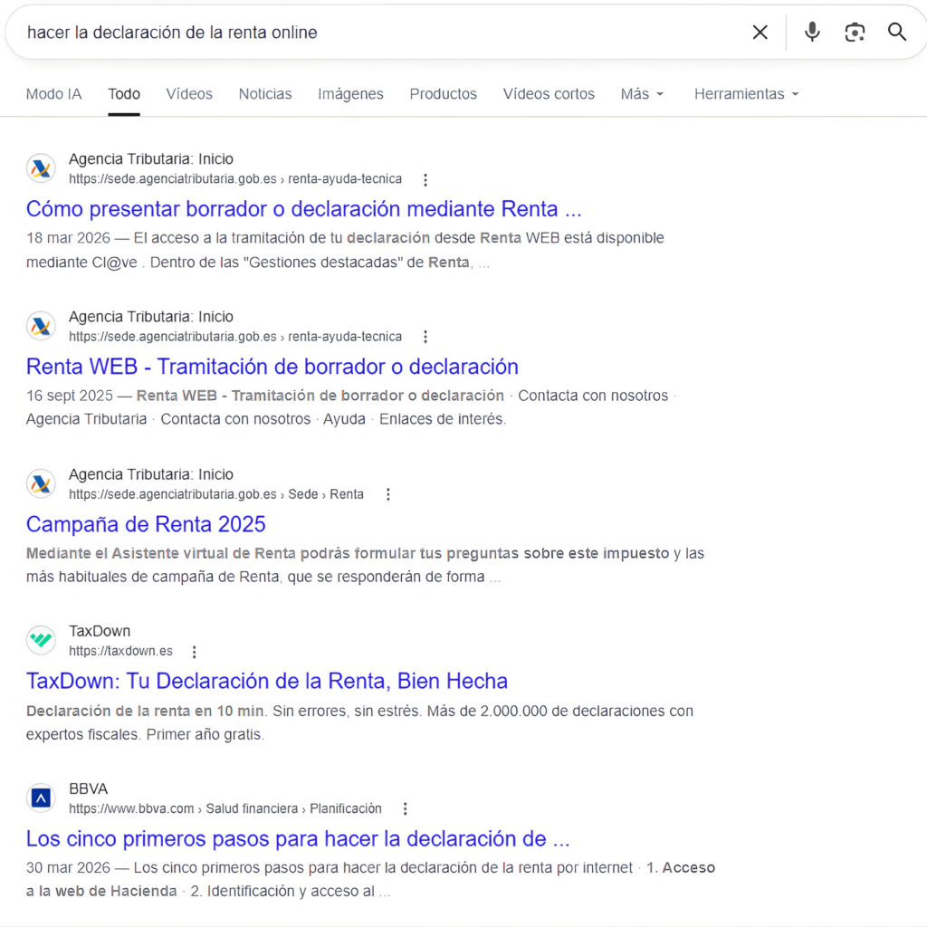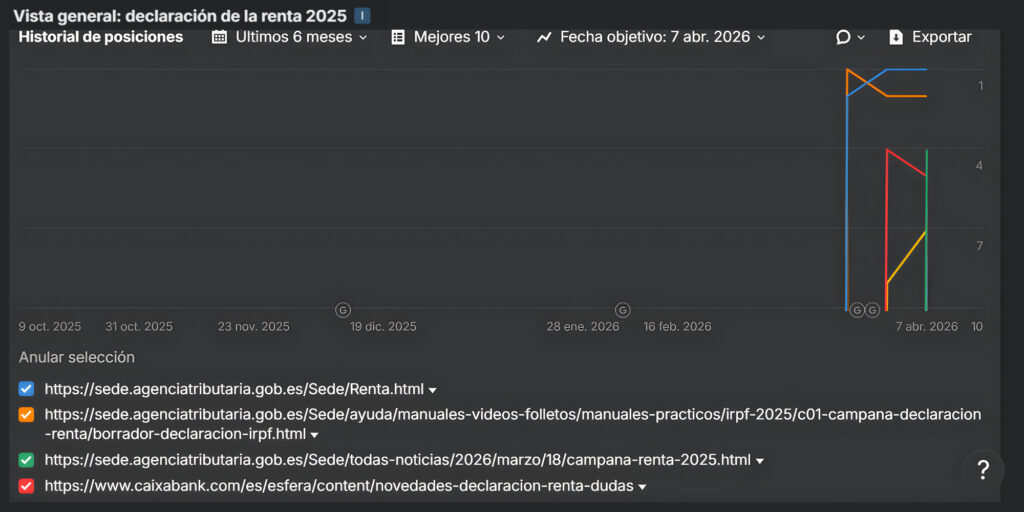 Esto condiciona toda su estrategia. No compiten por keywords transaccionales como “hacer la declaración de la renta online”, sino por búsquedas informativas tipo generales como “declaración de la renta 2025” . El objetivo no es captar al usuario en el momento de acción, sino estar presente durante la fase de información.