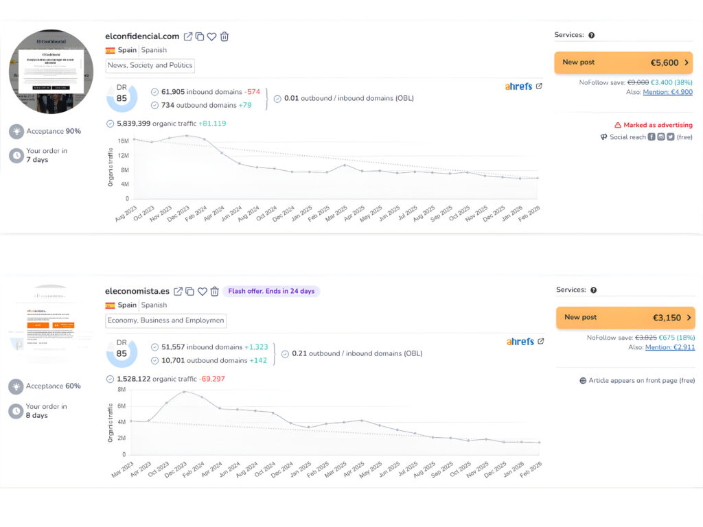 De esta forma, URLs que ya están en top 10 reciben refuerzos puntuales desde medios relevantes y escalan rápidamente a top 3. No es una estrategia de volumen, sino de precisión.